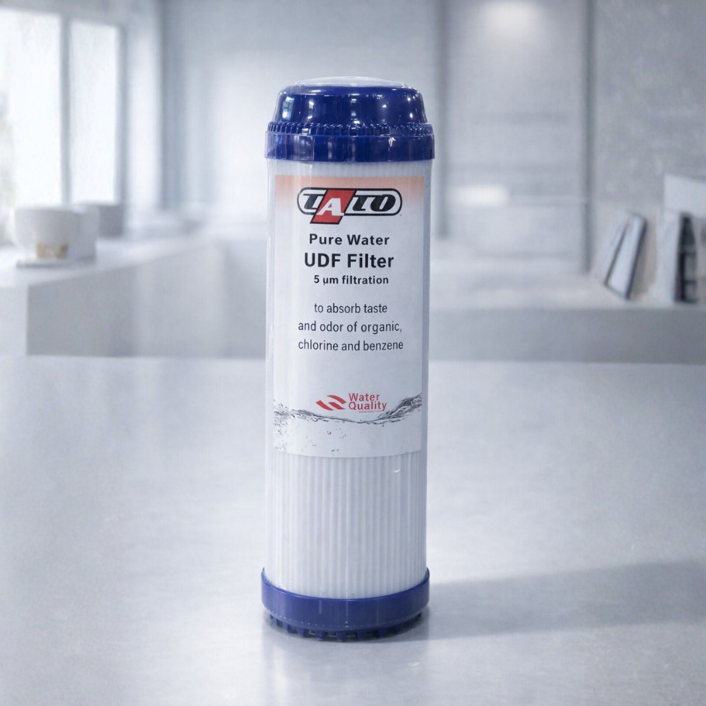 شمعة فلتر الكربون الحبيبي TATO موديل UDF بطول 10 بوصة مصممة لتحسين جودة المياه من خلال إزالة الكلور والروائح غير المرغوبة، مما يجعل المياه أكثر نقاءً وطعمًا أفضل.